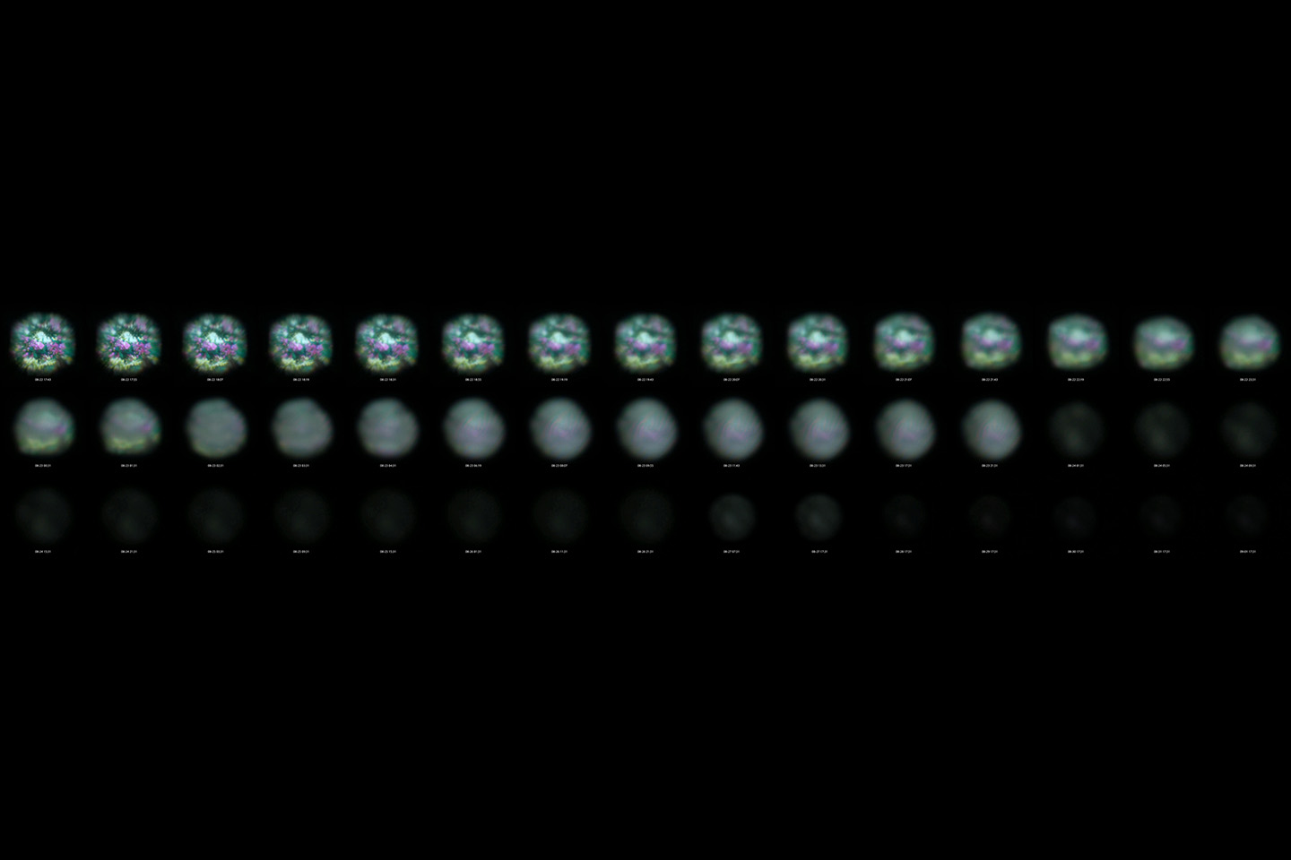 死後の世界から私たちの世界を覗くような、そんな装置をつくりたいと思っていた。生物の死後、肉体は朽ち果てる。眼球も腐り、やがて眼球でなくなる。眼球には水晶体と言う組織が存在するが、これはカメラで言うところのレンズのような役割を担っているものだ。その水晶体を、生命活動を終えた生物の眼球内から取り出し、装置に組み込んでレンズとして光を屈折させ像をうつす。時間と共に水晶体は腐敗しレンズとしての機能を失っていく。その最中に結ばれる光の像を段階的に記録し続けた。肉体のレンズが、肉体でもレンズでも無くなる図像とあなたは対面することとなる。