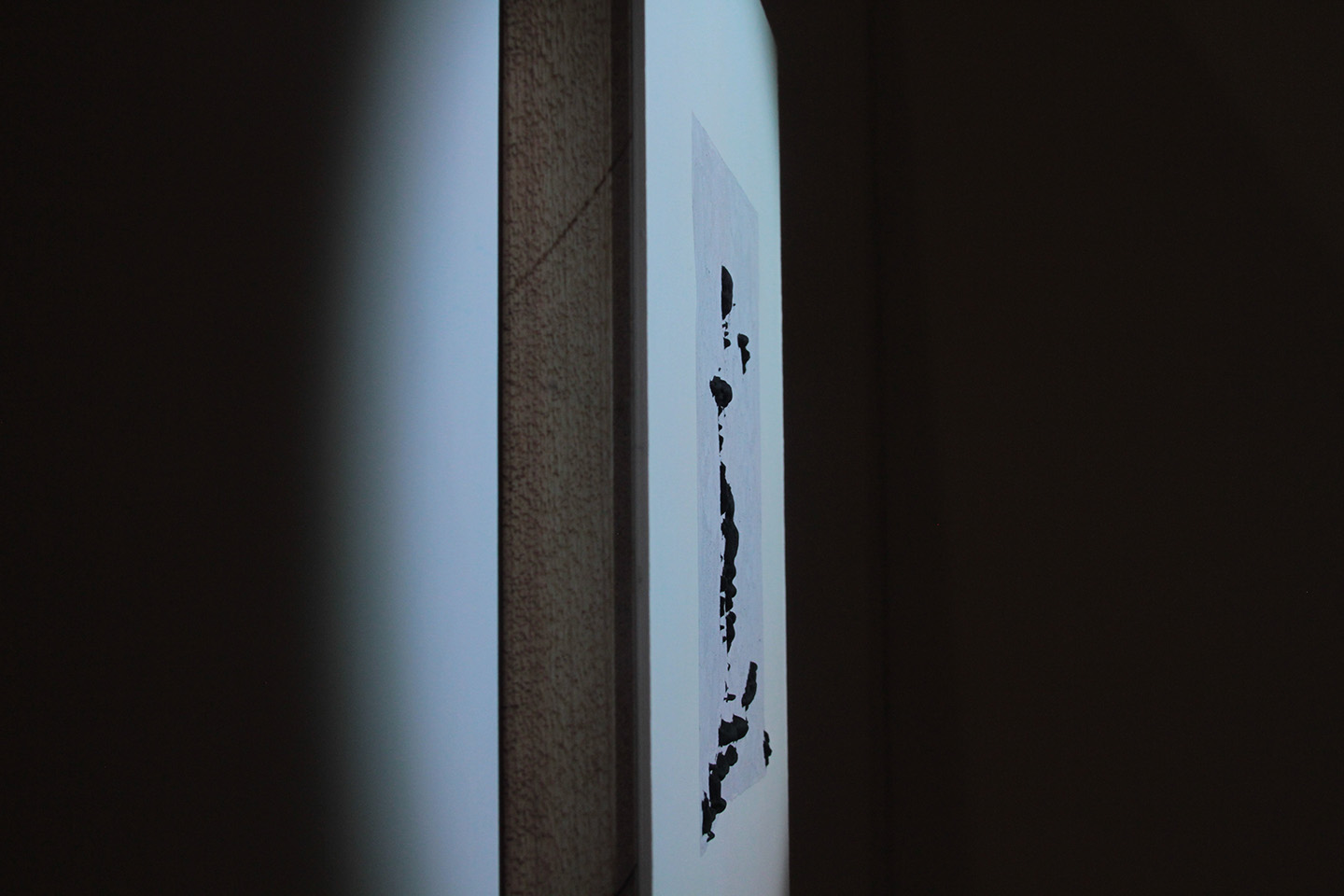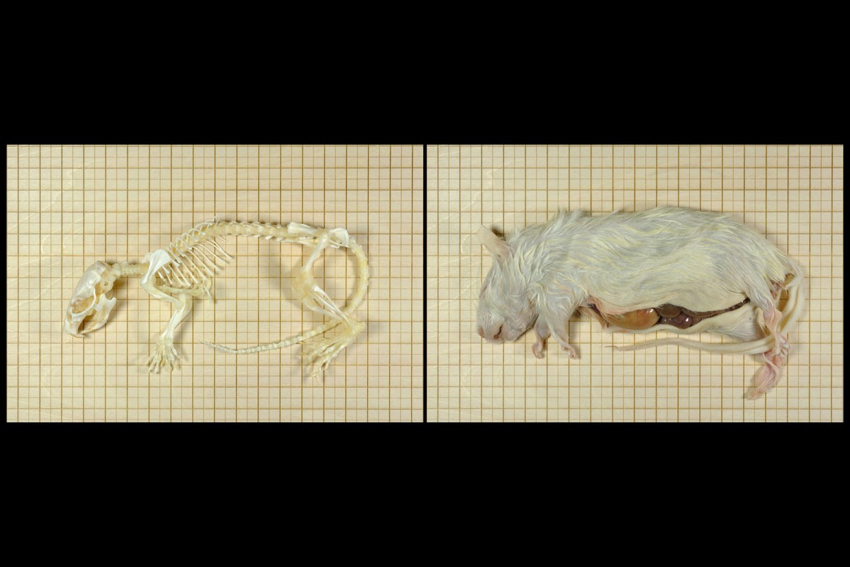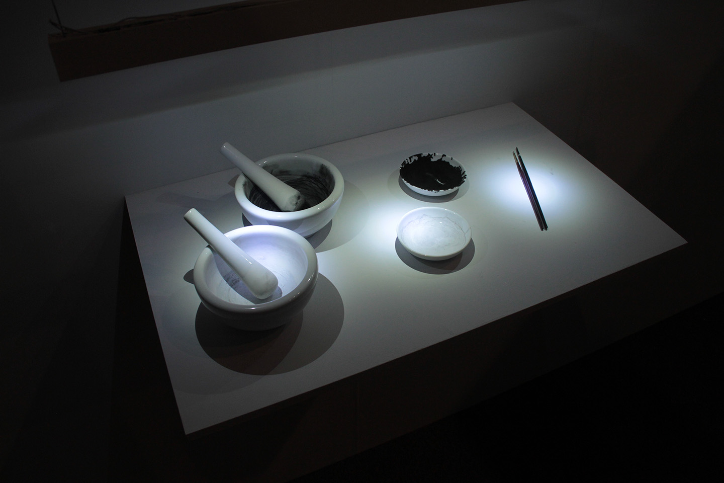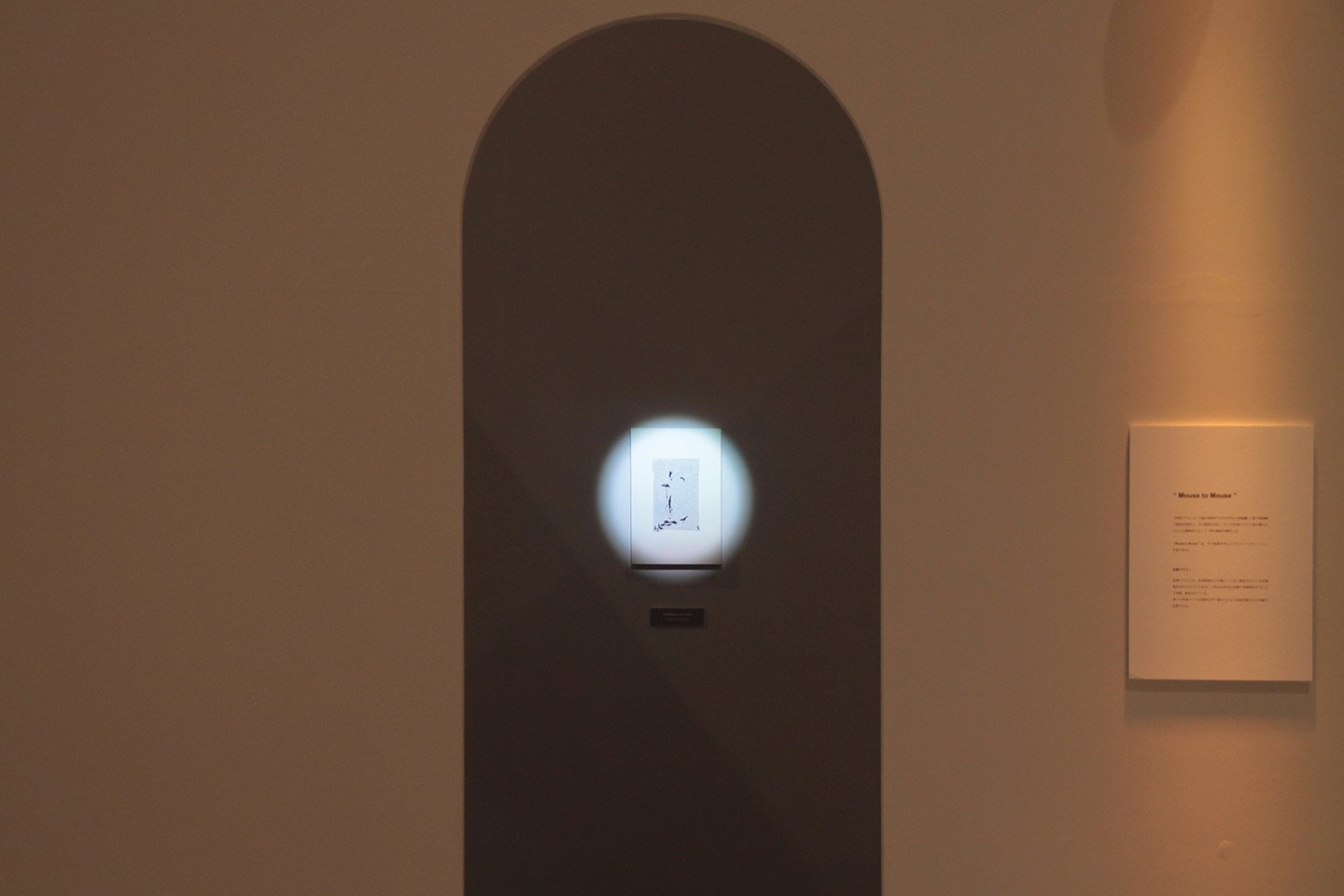 「冷凍マウス」という鼠の死体からそれぞれ白(骨組織)と黒(肉組織)の顔料を制作し、その顔料を用い、もとの冷凍マウスの姿が蘇るかのような描画法によって一枚の絵画を制作した。粉塵と化したマウスの肉体はもはや何の面影も持ち得ないが、そこからイメージとしての冷凍マウスが立ち上がった時、それを"亡霊"と呼ばずになんと形容すればいいのだろうか。 私は、本作を通して過ごした冷凍マウスとの3ヶ月を、忘れることができないし、忘れはしないだろう。