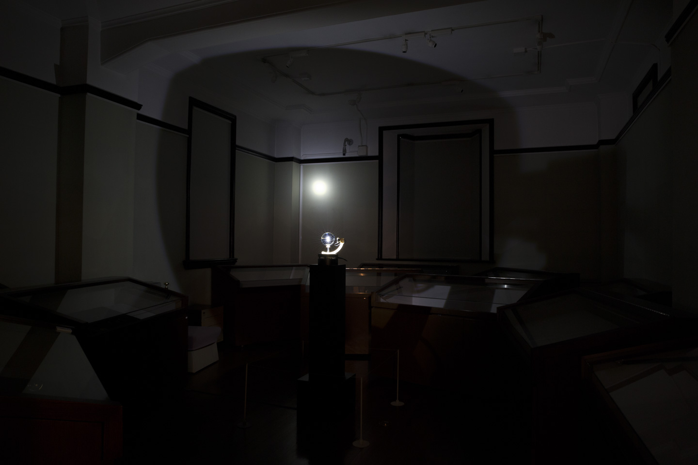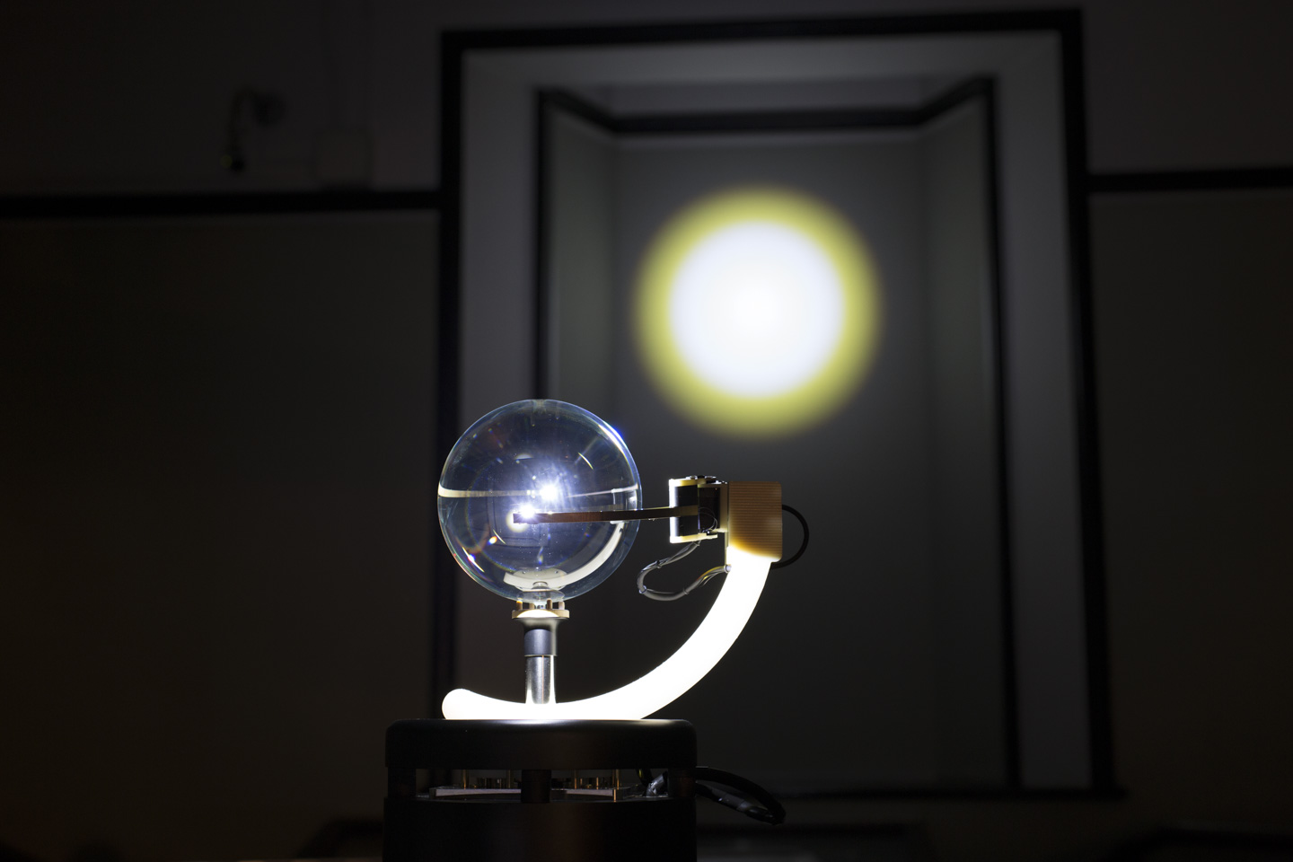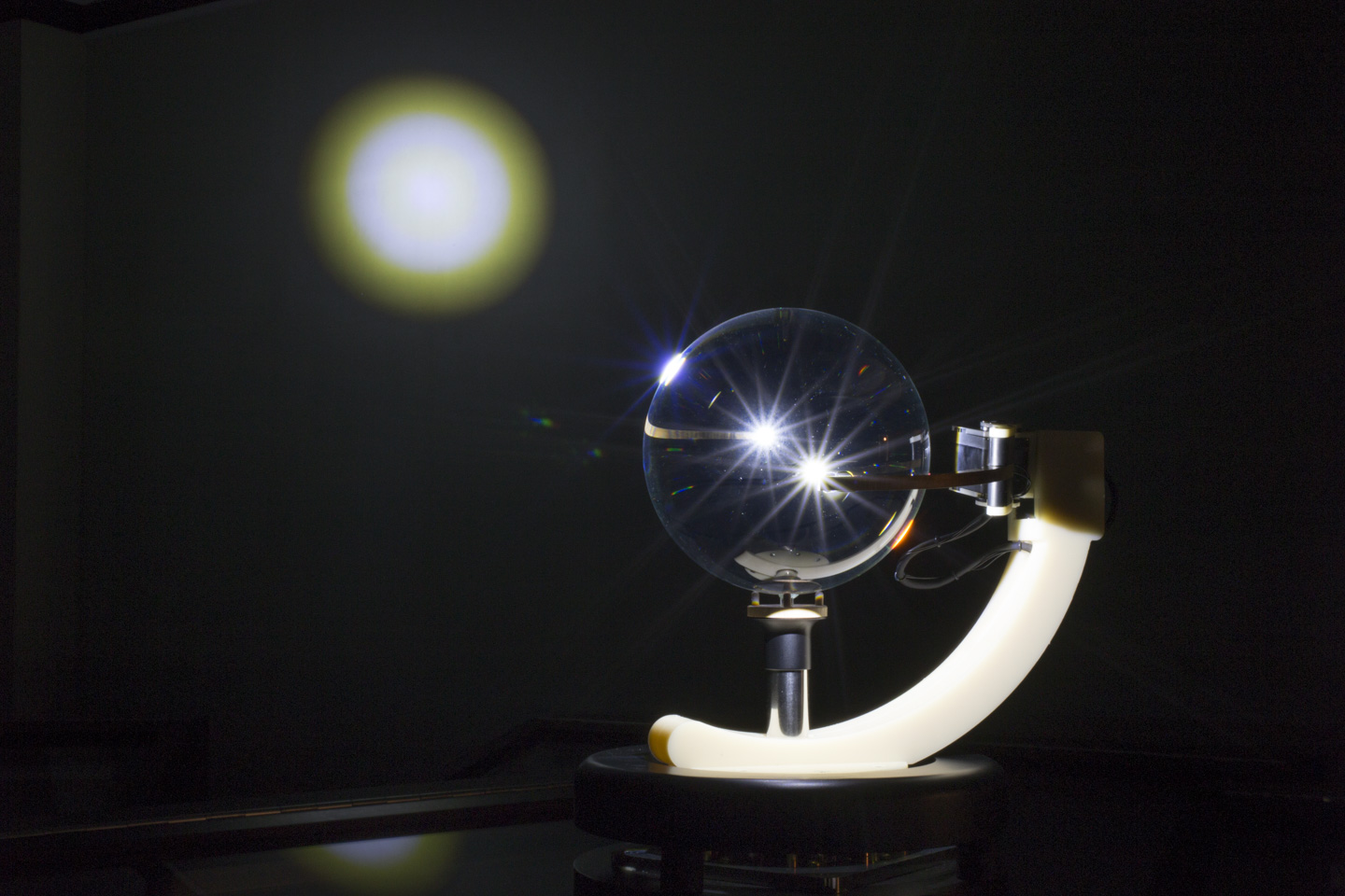 「球体の透明な石」と「光源」という純粋な構造をプロジェクション・メディアの原器として位置づけ、人類の好奇心と想像力を育んだであろう、そのレンズと光の原初的な神秘と科学を体現する投影装置はどのようなものになり得るだろうか。「月夜見の幻燈」は水晶玉と光源による投影現象を余すこと無く表出するために、設計と制作を続けている。水晶を中心に光が衛星(月)のように旋回し、あらゆる場所に光の現象を投影することが可能である。宝物でありながら球体レンズである水晶玉を介して照射される原初的な光の魔術を空間全位にわたってインストールする、そして当時の幻燈機のように工芸的な実用美と科学的な機構が混在した存在であるような、そんな幻燈機を目指してる。
