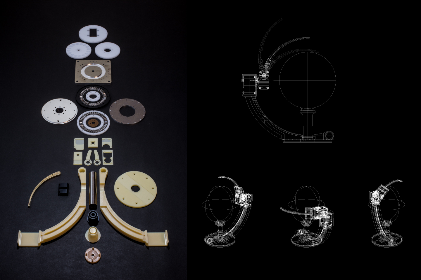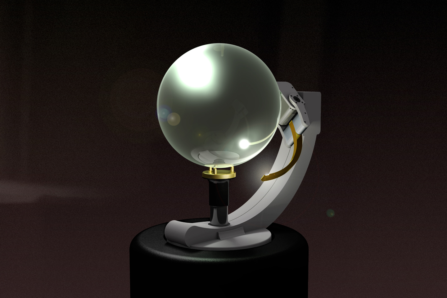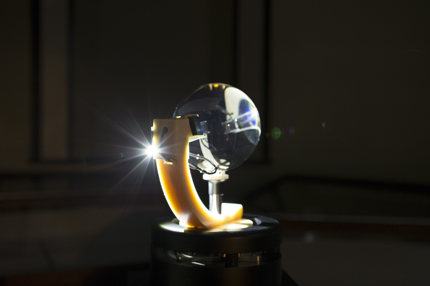 「球体の透明な石」と「光源」という純粋な構造をプロジェクション・メディアの原器として位置づけ、人類の好奇心と想像力を育んだであろう、そのレンズと光の原初的な神秘と科学を体現する投影装置はどのようなものになり得るだろうか。「月夜見の幻燈」は水晶玉と光源による投影現象を余すこと無く表出するために、設計と制作を続けている。水晶を中心に光が衛星(月)のように旋回し、あらゆる場所に光の現象を投影することが可能である。宝物でありながら球体レンズである水晶玉を介して照射される原初的な光の魔術を空間全位にわたってインストールする、そして当時の幻燈機のように工芸的な実用美と科学的な機構が混在した存在であるような、そんな幻燈機を目指してる。